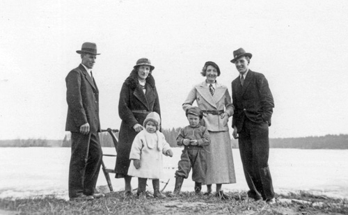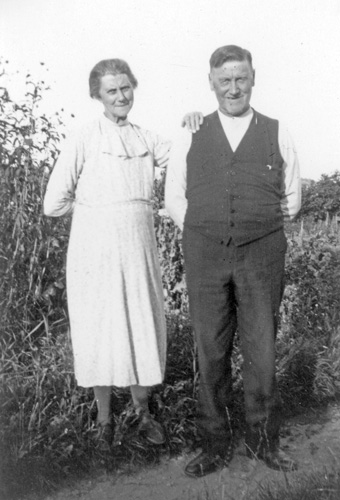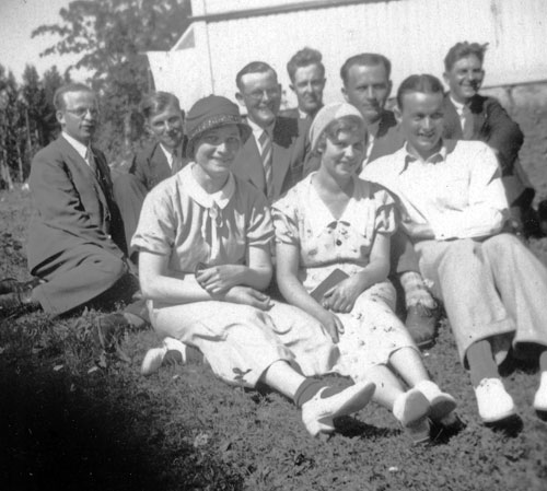 Bildtext: Mejeriet Lund Forsa. Mannen är Mjölnaren Anton Nilsson. Han arbetade i kvarnen till vänster om mejeriet. Kvinnan till höger om Anton är Anna Hallin från Norrviksta, en av mejeripersonalen. Övrig mejeripersonal okända.