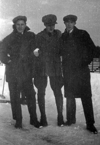 Bildtext: Isidor Åkman med keps. Vid linskäkten vid Forsa Kyrka. Tröskloge och skäktverket vid kyrkströmmens södra sida. Fotograferat omkring 1905 av Sundvall i Lund. Från vänster: Karin Åkman, Fru Svedin Rumsta?, Isedor Åkman, Tall?Cilken eller PalmKarin, Faster Margit i Glimsta, Marta Larsson i Hög, Per Persson (Palle) Viksta, Marta Sundin