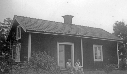 Bildtext: Mejeriet Lund Forsa. Mannen är Mjölnaren Anton Nilsson. Han arbetade i kvarnen till vänster om mejeriet. Kvinnan till höger om Anton är Anna Hallin från Norrviksta, en av mejeripersonalen. Övrig mejeripersonal okända.