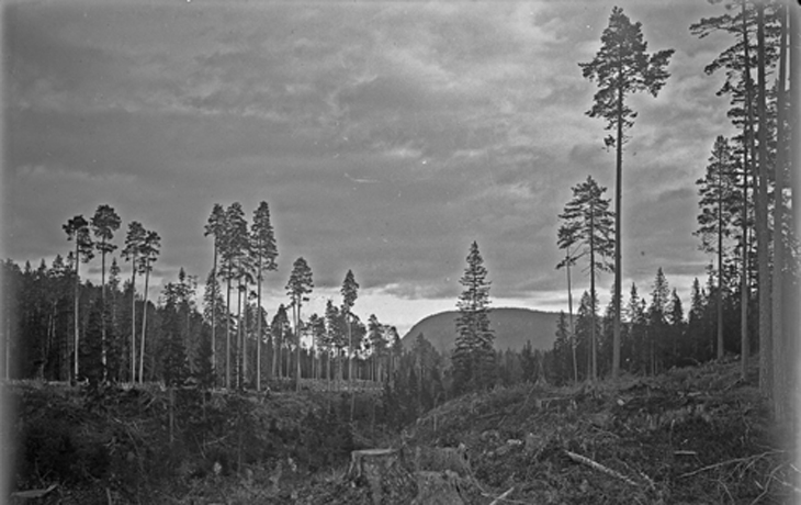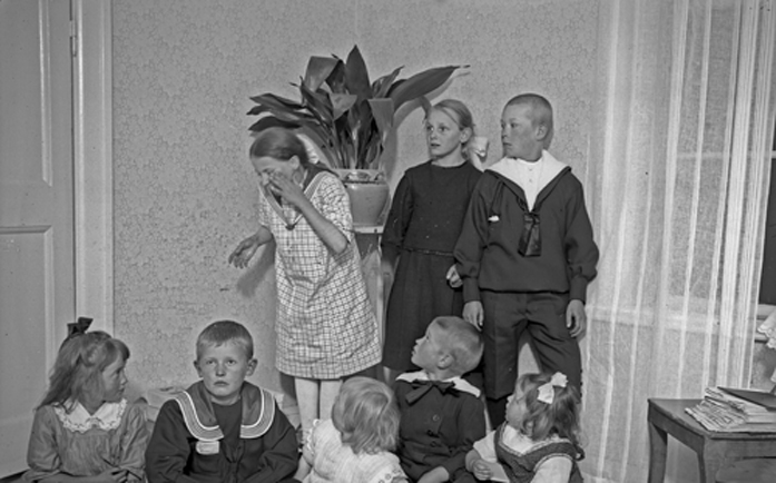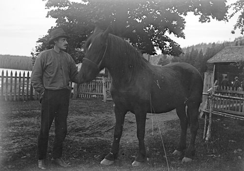 Bildtext: Besök i fäbodstugan i Ofärne sommaren 1923. På bron från vänster: Anders Eriksson (Klångsta), Karin Nilsson (Klångsta), Svan Anna (Bopiga), Märta Eriksson (Lund). I knät: Erik Nilsson (sedermera polismästare i Hudiksvall) I gräset: okänd kvinna.