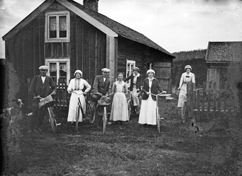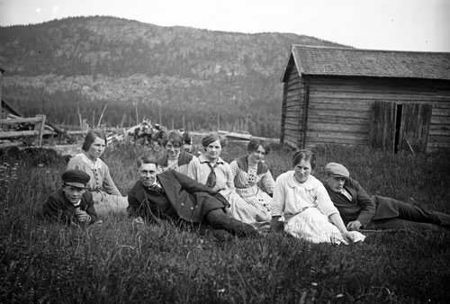 Sökord: fäbodstuga, kvinnor, män, Motivkategori:personer Id:6357 Fotograf: Nils Eriksson Fotoår: 1900-1930 Bildnummer: N-E-54 Förening: Forsa Sockens Hembygdsförening Land: SE Motivplats: Gävleborg, Hudiksvall, Forsa, Klångsta Teknik: inskannad glasplåt 9x12cm, s/v, 8-bitars gråskala 1300dpi Rättighet: privat sammling Originalplats: (visas ej publikt)
