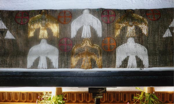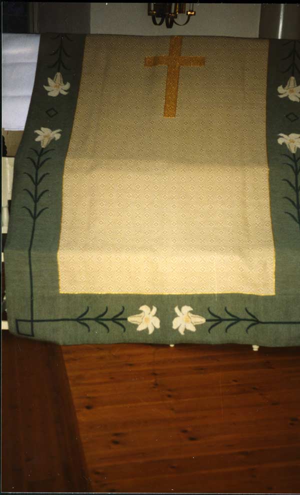 Bildtext: Denna textil är Forsa församlings bårtäcke vilket används vid jordfästningar istället för blommor på kistan. Bårtäcket är vävt av Kristina Jeanjour, Forsa och det invigdes 1995.