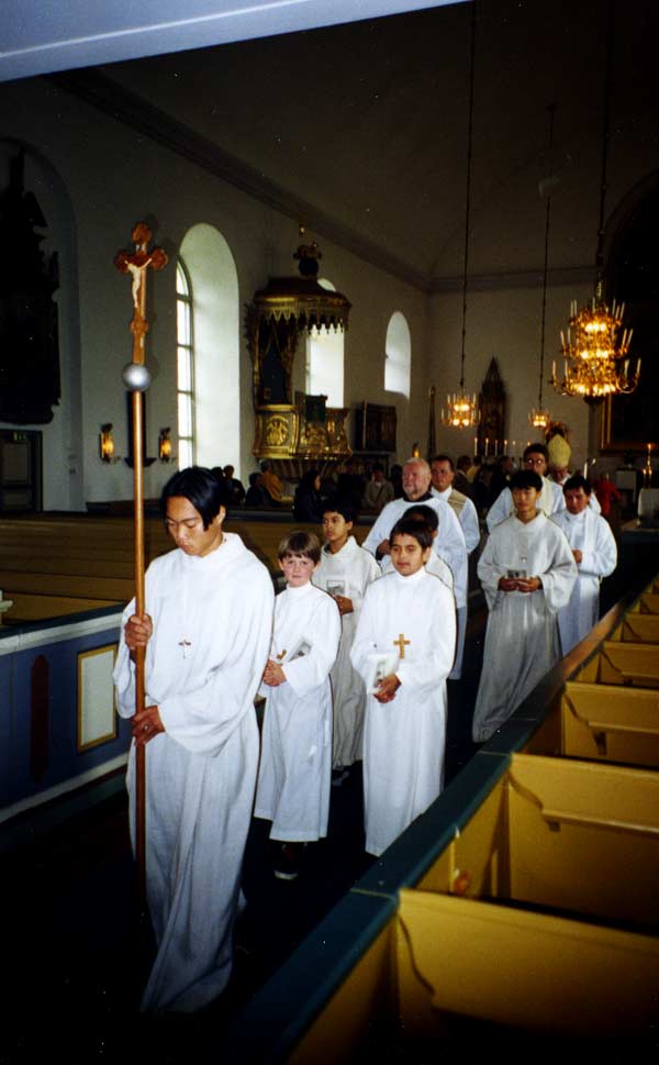 Bildtext: Utgångsprocessionen efter högmässan i Forsa kyrka vid 90-års firandet av katolska kapellet i Sörforsa.