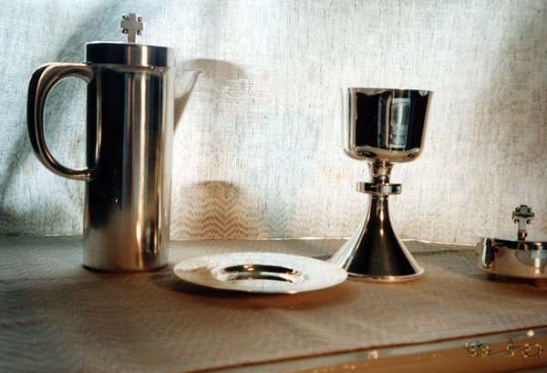 Bildtext: Nattvardskärl i silver av Erik Löfman år 1994, gåva av Algot Larsson