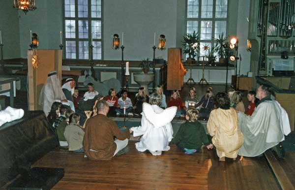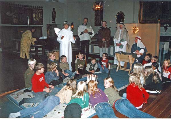 Bildtext: En sittande samling med Josef, Maria och Jesusbarnet och en ängel, en julsaga