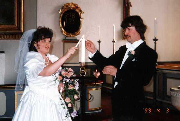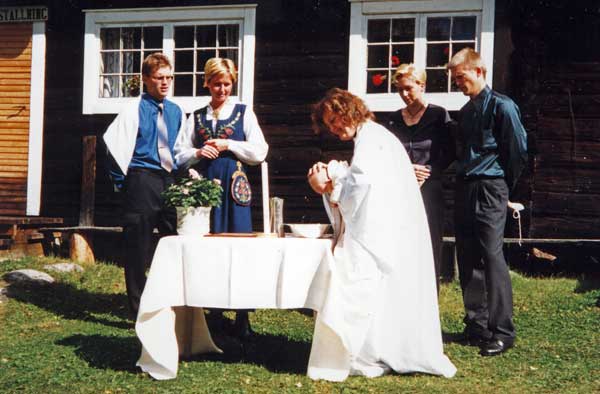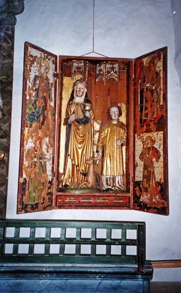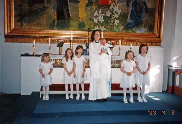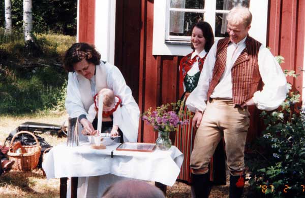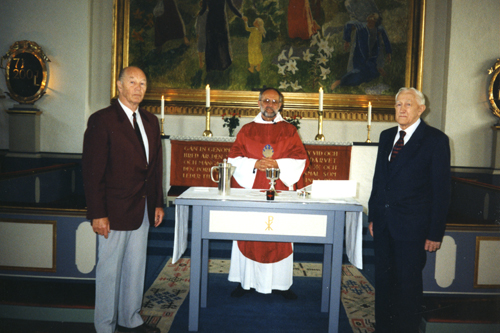 Bildtext: Donation av altarbord från Gösta Svensson, tv och kyrksilver från Algot Larsson. Kyrkoherde Sven Winterstam i mitten.