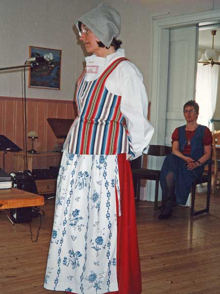 Bildtext: Kalmink livstycke, varprandad i 34 nyanser, vävd av Eva Ellingsen i Hög, sydd av Marta Trolin. 1700-talsmodell. Kattunförkläde i bomull samt kjol i kläde (ylletyg). Linnehatt. Överdel sydd i linne./Marta Trolin.