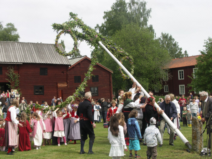 Bildtext: Resning av midsommarstången vid midsommarfirandet på Forsa Forngård, Fränö den 19 juni 2009, midsommarafton. Ca 2500 personer besökte tillställningen.
