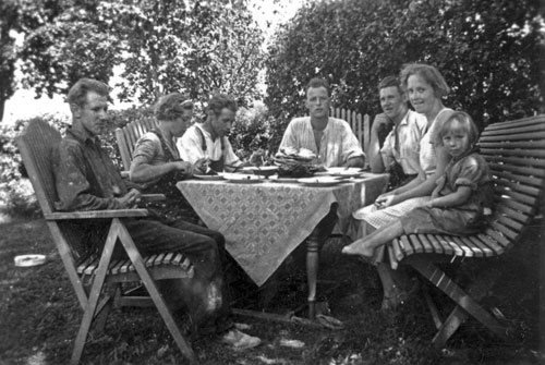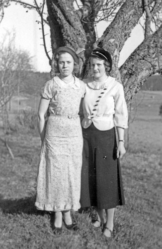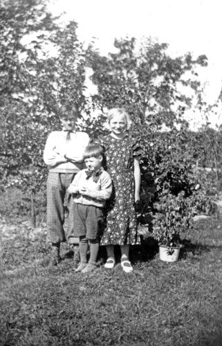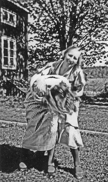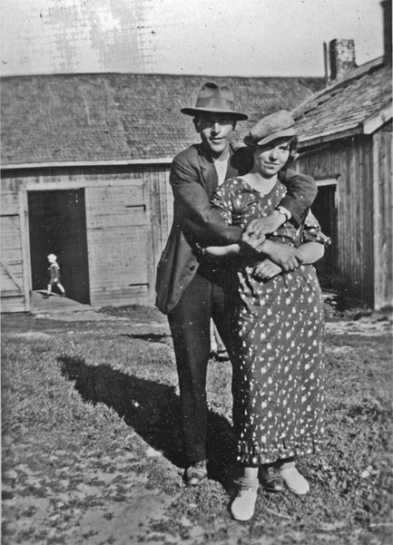 Bildtext: En man och en kvinna vid gammal gård. Mannen är nog Stenmark själv. Pojke skymtar i bakgrunden.