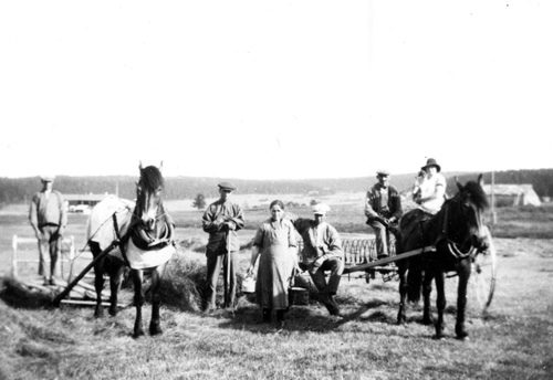 Sittande från vänster: Per Nilsson (PostPelle), Sara (Petters piga från Härjedalen), Nisse Eriksson. Längst bak från vänster: Lars Nilssson, Linnéa Mattsson (Månsson), Hilding PH Lindh, Karin Andersson (Fredlund) och Martin Bergström Tåsta (Ludvigs son)