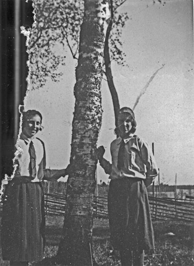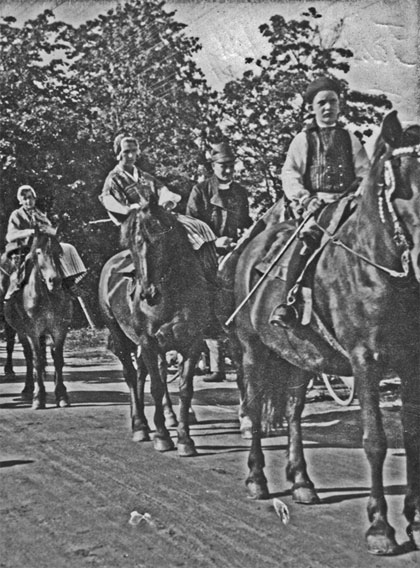 Bildtext: Festtåget till forngården i Fränö med JanJans Olles pojke i täten och Nanna Olsson från Utnäs samt Erik Olsson från Tövsätter efter.