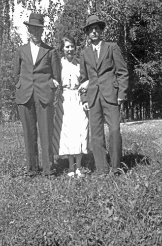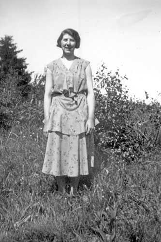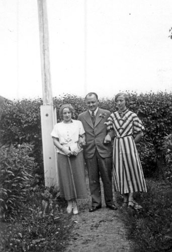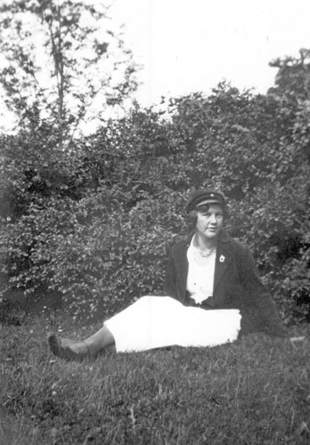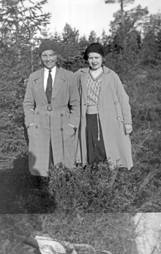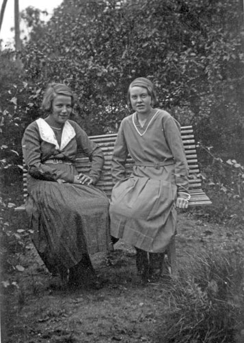 Bildtext: Två kvinnor på en bänk i fina klänningar. Till vänster, min mormor Anna Söderholm (född Wannberg).