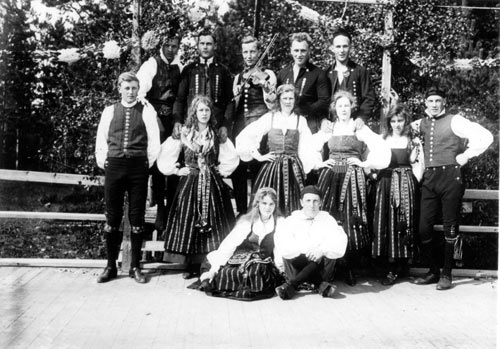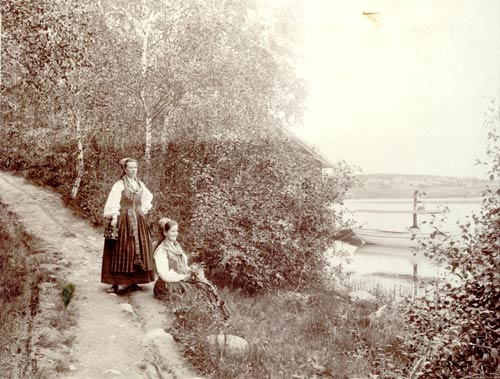 Beskrivning av motivet: Bilden är tagen vid sjön Ecklingen utanför Kus Britas stuga i Eckelsbo. Ruth är klädd i folkdräkt. I bakgrunden längst till vänster syns gården Spetbacken. Brita hade många delsbodräkter som hon lät folk prova. Brita var ju dessutom sömmerska. Det finns ett flertal bilder tagna på den här platsen med folkdräkter.