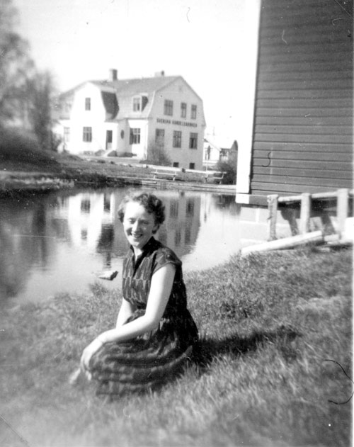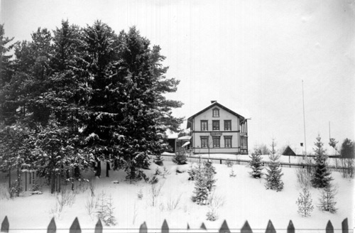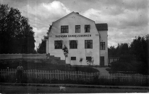 Bildtext: Taget från tornet på Edeborg. Köpmangatan mot Stömnesjön med Stömne i bakgrunden. Storgatan (R84) finns inte än. Främre mörka husen med vindsnurra är Upplands Enskilda Bank. Nästa hus till höger är Central Cafe't eller Knobbens. Huset till vänster tillhörde Sundbergs (som gift men föddes i Skäftgården). Numera är huset J. Larssons möbelaffär.