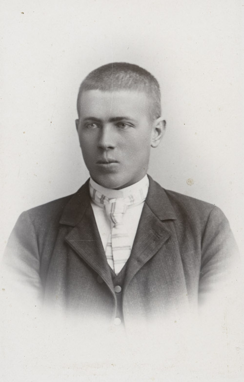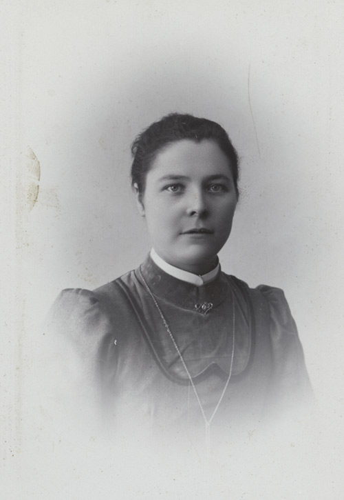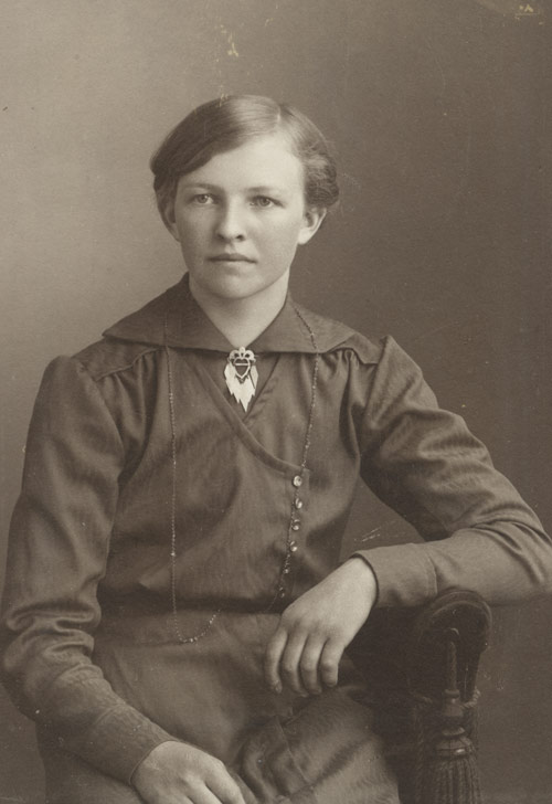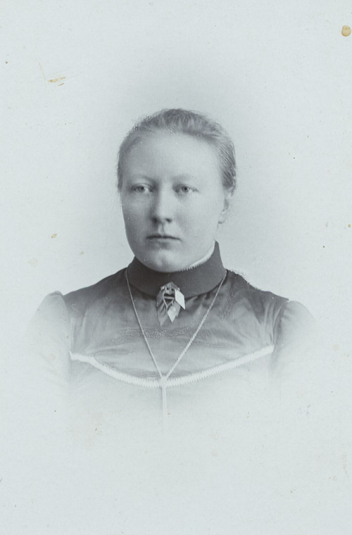Bildtext: "Kristin-på-växeln", eller Kristina Andersson. // 2013-05-16 Vanja Persson skriver att det här är "Kristin-på-växeln", eller Kristina Andersson som var hennes rätta namn. Hon föddes den 4 maj 1882 som dotter till bonden Anders Andersson och hans hustru Marta Larsdotter i Vålsta s3, Forsa socken. Kristina blev den första telefonväxelföreståndarinnan i Hög, därav namnet. Kristina avled den 30 maj 1946. I tidskriften Högs-Fåret av årgång 1999 finns Kristina med samma fotografi som "omslagsflicka".