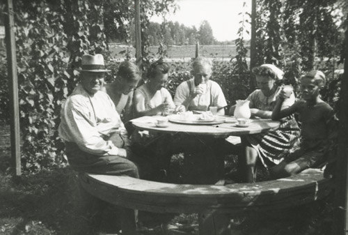 Sökord: fritid, tre män, två kvinnor, ett barn, kaffebord, kaffekopp, mjölkkanna, berså, trädgårdsmöbel, Motivkategori:ute Id:6676 Fotograf: Fotoår: Bildnummer: DAA-185 Förening: Delsbo Hembygdsförening Land: SE Motivplats: Gävleborg, Hudiksvall, Delsbo, Vij Teknik: 8,7 x 5,8 cm, inskannad påsiktsbild, 48-bitars färg, 800 ppi Rättighet: Delsbo Hembygdsförening Originalplats: (visas ej publikt)