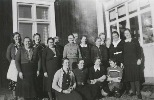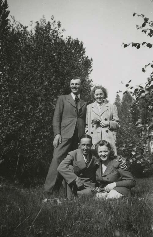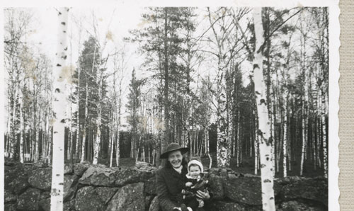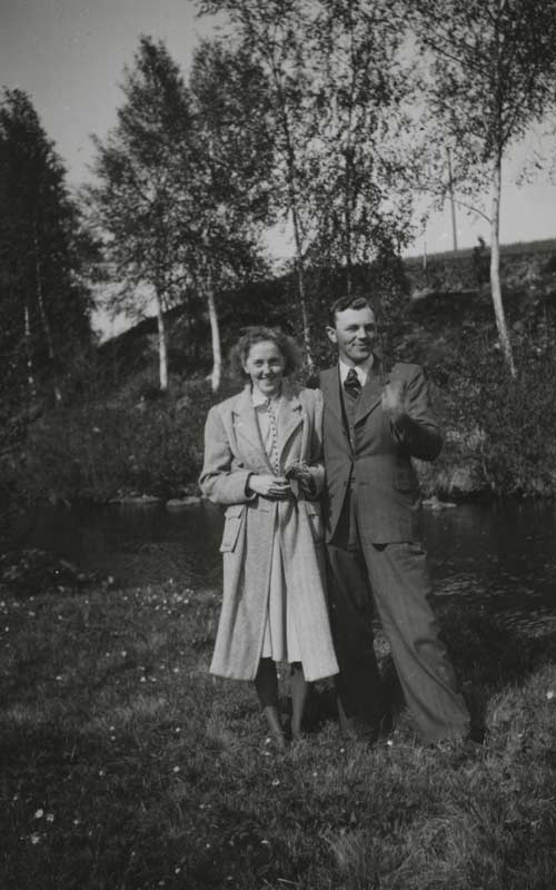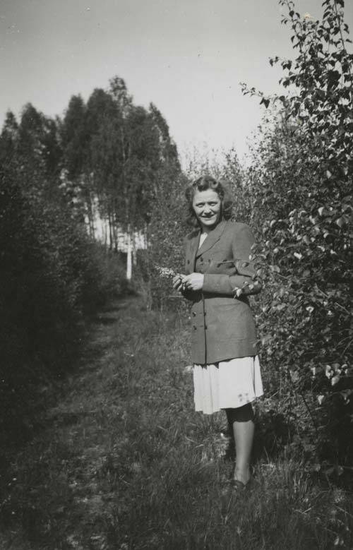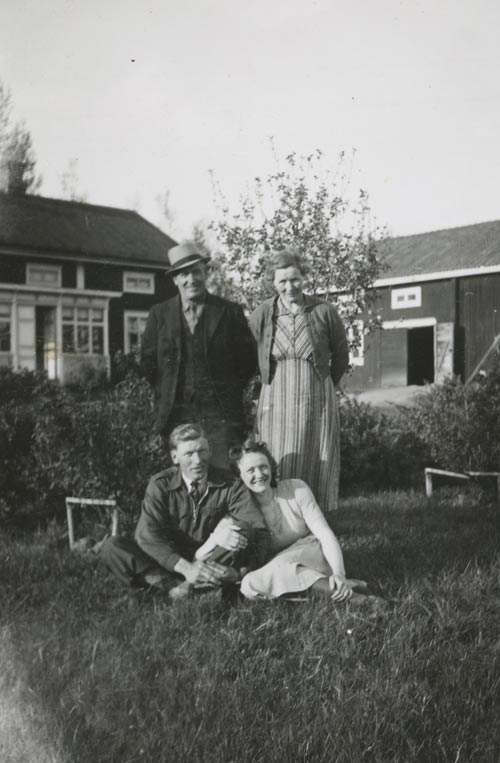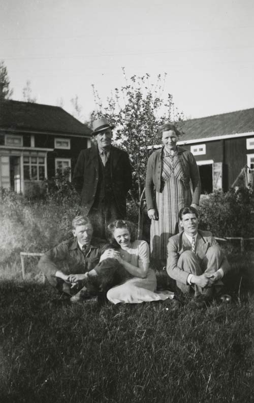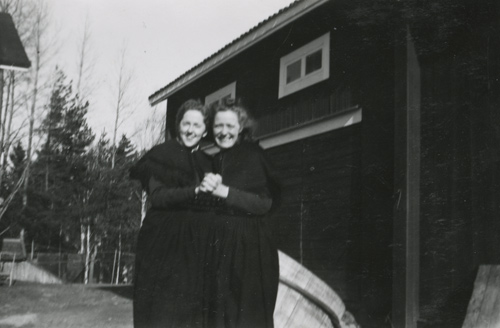 Bildtext: Enl. foto: Svea, Elsie, Albert vid kvarnen. // 2015-07-20 Dan Anderson: Från vänster Svea Andersson (Färms Svea), Elsie Johansson (Wessman) Sandarne (Sedemera Uppsala) samt Albert Jonsson (Skrot Albert) Östertolbo Delsbo. Platsen är vid backen ned emot Glombo kvarn Bobygden Delsbo. Året är 1943. Fotograf okänd.