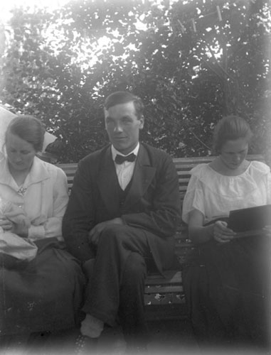 Bildtext: En grupp okända människor framför ett hus. Sannolikt det hus som idag ligger under adress Tytterövägen 4 i Oppänge, Enånger. Numera att betraktas som fritidsboende. En uppgift anger att stenhuggare Harald Nilsson (f 1885) och hustrun Hulda bodde i huset kanske ända in på 1950-talet. Efter koll på detaljförstoring så ses det som sannolikt att personerna 3 och 4 från vänster är just Hulda och Harald i rätt unga år, vilket visar att bilder bör vara från tiden omkring 1910.