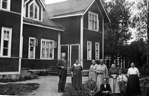 Per Nilssons hem Änga. Per Nilsson i Änga i mitten med käpp. f 1848 d 1932. Till vänster om honom sitter systersonen Nils Olof Engman f 1870 i Änga d 1932. Bakom om Nils Olof står hans hustru Selma f Östby 1882 i Bäckmora. Nils-Olof och Selmas båda barn, Valter och Hilma, står längst bak till vänster. Valter Engman f 1913 flyttade från Änga 1944 till Ingesarven, Bergsjö. Hilma f 1907 gift Sundin i Sätra. I Nils Olof Engmans famn Hilmas dotter Stina f 1925. Nedre raden till höger Erik Mickelsson f 1857 (även kallad Molin) och till höger om Selma Engman, Bricken Mickelsson f 1864.