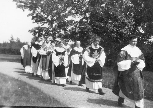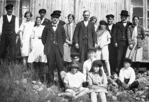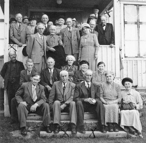 Bildtext: Pensionärer från Enånger samlade vid ingången till Godtemplarhuset (IOGT-lokalen). Tre är märkta med X och de skall vara August Burman, Axel Berg och Ostlund (Östlund?) som brukar vara vid Långvind. Vem som är vem framgår ej. Inkomna bildsynpunkter kompletterar med följande namn: Femma från vänster på förstugukvisten är Anders Olof Thorén och damen i vit hatt till höger nedanför är hans fru Anna Thorén. I främre rad fr v: August Landin (Bölan), August Burman (Holmen) och trol. Axel Berg (Borka). Stående under vänster kryss Lars Östlund (Bölan), damerna i samma rad: Margret Händel, Anna Rolinder, Alma Landin (fr v o samtliga Bölan). I grå mustach och stående bakom Östlund: Otto Henriksson (Bölan). Med hatt på sned invid dörren: Herman Hermansson (Bölan), vid den andra dörrposten Anders Söderholm (Bölan). Kompletterande bildsynpunkt: Mannen längst fram sittandes, tredje mannen från vänster är Axel Berg, min farmors far. Det finns ett annat foto på honom, ett porträtt på tidigare sidor här. Han var ordförande i fiskareföreningen i Borka. Axel Berg levde mellan åren 1876-1957. (Noterat av Ulla Walén). Ytterligare bildinfo: Det finns även ett fjärde kryss. Över mannen längst till höger som är Hans Olov Östlund från Bölan. I mörk kavaj i mitten: Thorén.
