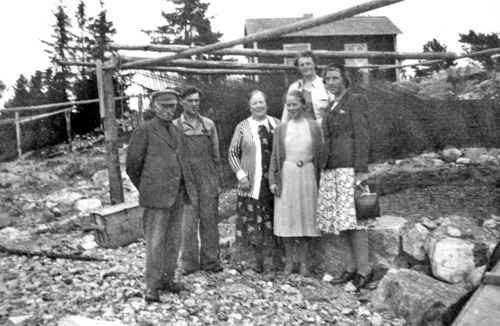 Bildtext: Kvinnor och män samlade vid tröskning hos Rehnströms i Vedmora. Personerna är fr.vä. Kristina Frisk, Albin Sjödin, Eivor Rehnström, Kristina Lindblom, Axel Rehnström, Ev. Einar Norin, Ida Rehnström, Martin Newberg och Evert Lindblom.