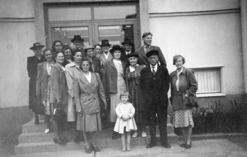 Bildtext: "En glad afton hos tant Marta i Vedmora". 1:a rad: Gustav Paulsson f 1921 fosterpojk hos fam Frisk 1G115 o 126, August Frisk 1881-1937 1G79 o 115, Kristina Svedlund Frisk 1877-1957 14G16 o 1G115, Ida Frisk g Rehnström 1902-1990 1G115 o 124, Hedvig Svedlund g Enström f 1911 14G18 o 2H23. Bakre rad: Eva Gustavsson g Nilsson f 1901 21T1, Oskar Svedlund f 1907 14G18, Axel Rehnström 1901-1984 1G124, Olga Svedlund g Nordlund f 1912 14G18 o 10F16, Agda Smedberg lärarinna fr Boden, Edvard "Vinlund" Andersson f 1909 6T10 dräng hos Kjellins - flyttade till Luleå 1927, Alfred Svedlund f 1905 14G18 o 20