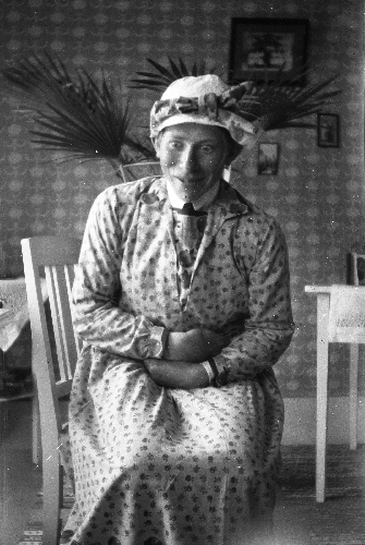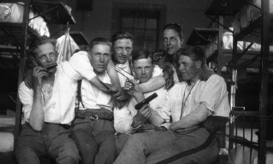 Bildtext: Vid Hanses stuga i Österåcka, fr.v Emil och Anna Hansson, Rune Sättlin Tosätter. Sedan Alice, Bernhard och Olle Lantz Boda, Sen Olle och John Johansson Tosätter