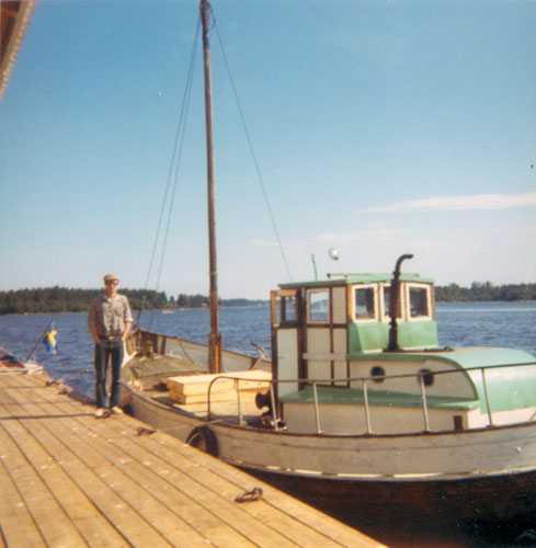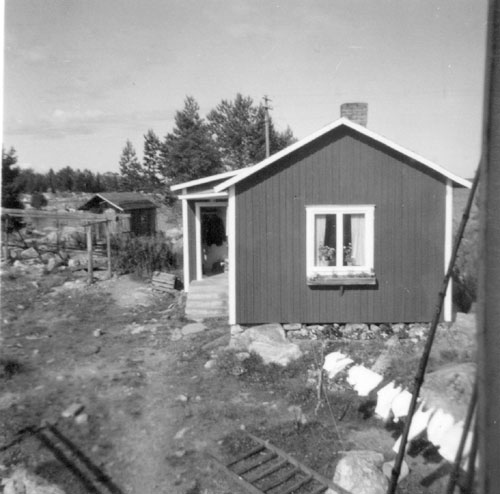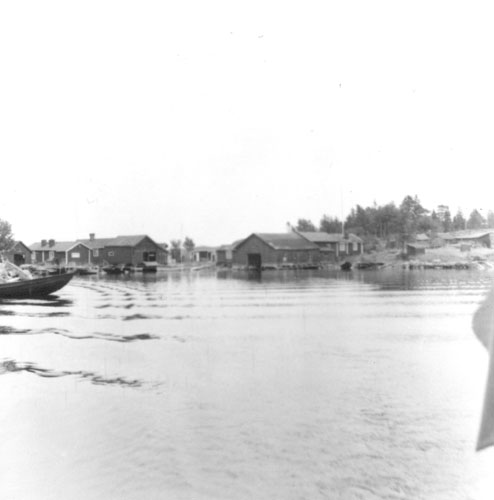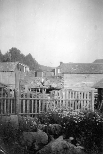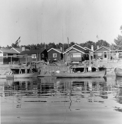 Bildtext: Henning Johnsson lagar strömmingsskötar på Bergön. Bildinlämnaren berättar: Henning, halvbor till Arvid Enström, emigrerade i mycket unga år till Denver i Colorado. Han arbetade där som byggnadsarbetare, och så småningom med eget byggföretag. Besökte Sverige en enda gång därefter, 1968, som pensionär och änkling. Besöket varade 3 mån. Han pratade då med oss på felfritt om än något ålderdomligt Enångersmål. Allt omkring fisket och att laga skötar mm det kunde han också.
