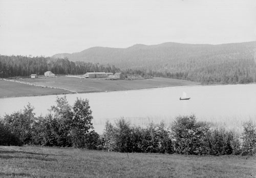 Sökord: vy, gårdar, hus, byggnader, sjö,