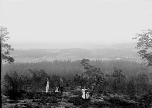 vy från Vedmoraklappen med människor i förgrunden, byggnader i Vedmora samt Enångers kyrka skymtar