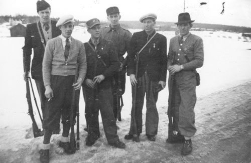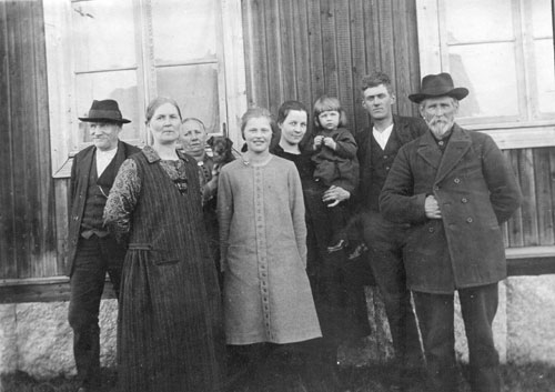 Bildtext: Bakre rad fv: okänd, Anna Gustavsson, Ingegerd Wallin, Vanda Hallberg. Främre rad fv: Gustav Gustavsson (Grånken), Anna Gustavsson, Ingrid Eriksson, Adolf Gustavsson. På skidor till vänster Bernt Eriksson. Inkommen bildsynpunkt meddelar: Bakre raden längst upp till vänster verkar vara min morfar Frans Oscar Hallberg, gift med Vanda Gustafsson. Uppgiftslämnare: P-O Hallberg