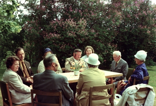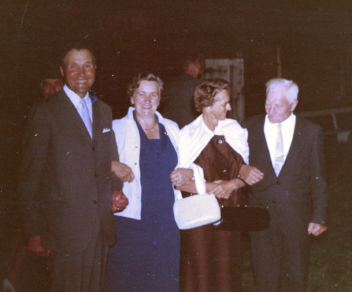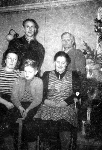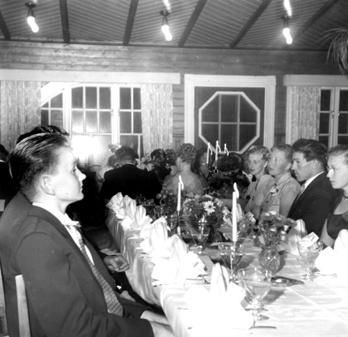 Bildtext: Julhelgssamling runt kaffebordet 1941 i Vedmora. Stånde från vänster; Lars-Erik Svedlund, Gustaf Forsberg(i svart), Evert Lindblom(i vitt,drunknade 1953 i Hedasjön), Eivor Rehnström, Johan Forsberg och Maj-Britt Malmström(fosterflicka hos Svedlunds). Sittande från vänster; Christina Svedlund, Bricken Forsberg, Ida Rehnström, Gunni Rehnström, Axel Rehnström, Kristina Frisk, Astrid Forsberg och Gull-Britt Malmström(fosterflicka hos Svedlunds).