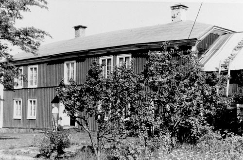 Bild från Åkre gård i Enånger en kort tid innan rivningen 1964. Skylten vid dörren anger "servering". Minner om den tid i början på 1960-talet då det drevs sommarcafé och camping på fastigheten.