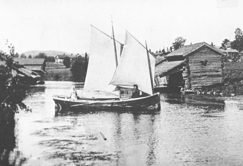 Motiv från Enångersån vid Packarlaven (Packerslaven Packalavan), Enångers tidigaste hamn. Tidstypisk Enångersbåt med rak förstäv. I båten fiskaren Gustaf Stakel (1853-1925) och hans syster lärarinnan Ingeborg Stakel (1852-1937)