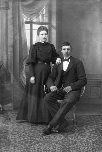 Bildtext: Greta och Anna Borin, Nyåker. Anna Borin sittande på soffan, nästan identisk med bild id: 1363