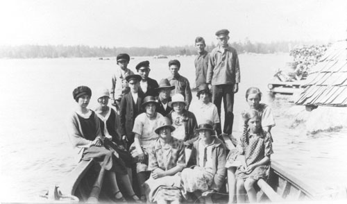 En grupp människor i en båt, någonstans i Enångers skärgård. Eva Andersson (Fjäle) i mörk hatt i mitten, Ulrika Hansson (Bölan) i ljus hatt bredvid. Märta Kjellin och Signe Hansson (Bölan) nedanför. Sven Kjellin (Bölan) i hatt. Kompletteraing: Och bredvid Ulrika Hansson är det ganska säkert Helena Nagel (g Söderholm). Dessutom figurerar Adolf Andersson bredvid Sven Kjellin.