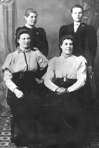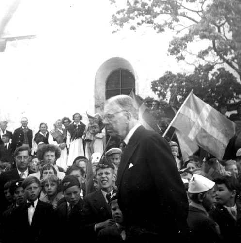 Bildtext: Kyrkstädning en sommar på 1950-talet, plats kyrktrappen till nya kyrkan. Från vänster: Karin Sundqvist, Anna Gustavsson (Moråker), Erik Asplund, Anna Borin g Edström, Karin Johansson, Kristina Lindblom, Maria Åker. En bildsynpunkt meddelar följande iakttagelse: det var solförmörkelse under denna tid, och Erik Asplund hade sotade fönsterglasbitar som man kunde titta på solen med. Jämför även bild cae-priv-52 och aker-20
