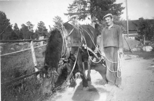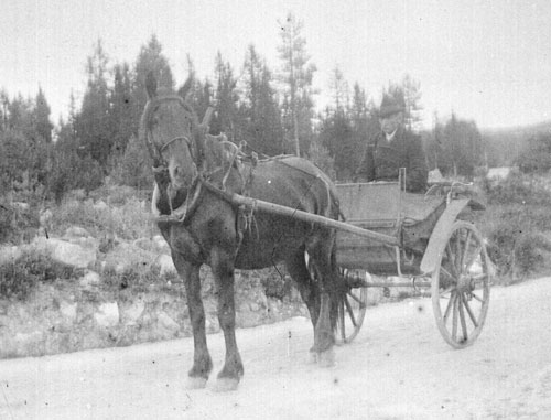 Bildtext: timmerkörning med häst till ett avlägg, plats Holmen där bl.a. skolan skymtar och ett antal hus som numera är rivna. Snarlik bild med nummer: en-ak-280