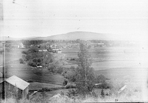 Bildtext: Vy över fäbodstugorna i Känna från sjöstranden, Kännaåsen i bakgrunden