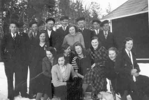Bildtext: En grupp människor, sannolikt samlade i "Lombo" Finnika, följande namn har noterats: John Svedin, Hans-Olov Olsson, "Landbo-Olle" Enström samt dennes syster Edit, Dagmar Berglund, Hanna Matsson