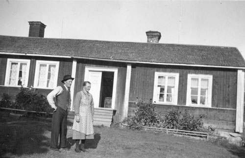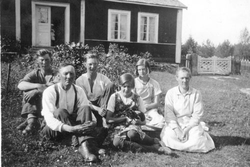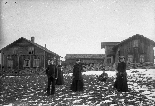 Bildtext: Skulle kunna vara Lars-Pers i Haga, Karin Hercules hus. Jämför Id 7417, bildnummer: gha-113. Notering från Eliot Burman; Gården th är A O Westlings, ägdes tidigare av skepparen Anders Burman. Från vänster: Rune Hagbom reste till USA 1907, Emma Westling, Karin Hellman, Gustaf Väsberg reste till USA, Kristina Hagbom mor till Rune - sömmerska - reste Också till USA