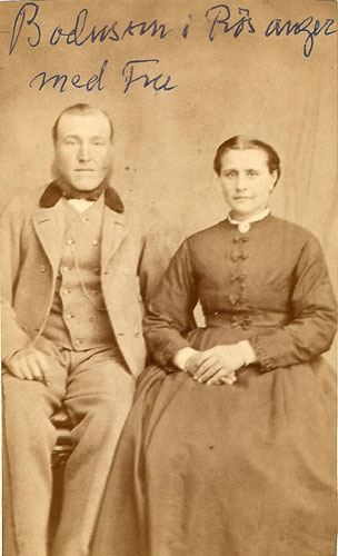 Bildtext: Lars Johan Bodinsson med hustru Brita, Rösånger 2:3. Lars Johan född december 1866, ende son till Anders Larsson Bodinsson f 1838 Rösånger och Catrina f Jonsdotter 1844 Nordmyra, Njutånger. Brita född Larsson feb 1867, yngsta dotter till Lars Persson f 1823 Bäckmora och Margreta f Persdotter 1822 Boda, Njutånger. Lars Johan och Brita fick 8 barn: Ida Margareta f 1892, Karolina f 1894, Bricken Elenora f 1897, Anders Josef f 1898, Bricken 1901, Anna f 1906, Elin 1908 och Edit f 1912. Inkommen bildsynpunkt reflekterar: Någon vet detta bättre: men kan det inte t o m vara den äldre generationen. Paret födda 1838 och 1844. Det är i alla fall min gissning och att fotot härrör från 1870-talet