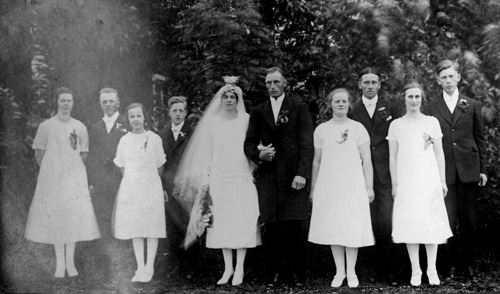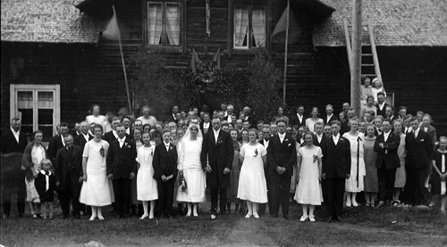 Sökord: brudpar, folksamling, byggnad, flaggor, gruppfoto