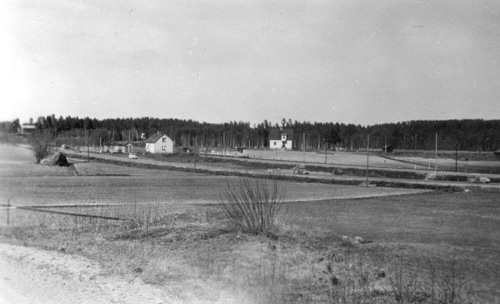 Bildtext: vy över delar av Vedmora sett från söder, Otto Bergströms till höger, och ”stationshuset” (Vedmora järnvägshållplats) i centrum, Riks-13 hitom järnvägen. Inkommen bildsynpunkt meddelar: Bilden är tagen våren 1955. Stolparna för kontaktlednigen är resta. Elektrifieringen gjordes under sommaren och var klar i nov./dec.samma år.
