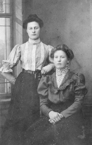 Bildtext: tre okända kvinnor i en båt. Platsen är dammen ovanför landsvägsbron i Bro, med gamla kyrkan, kvarnen och gamla posten (mejeriet) i bakgrunden