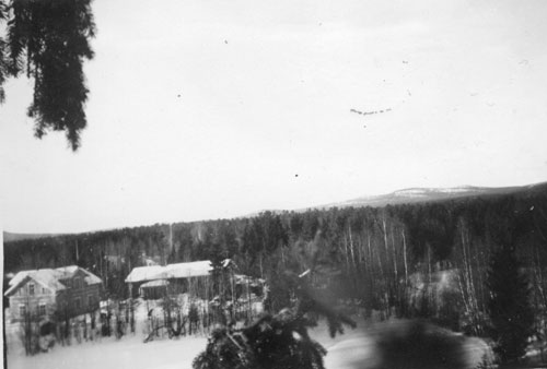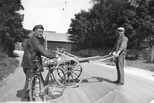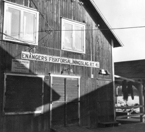 Bildtext: Foto taget ungefär från Franks affär i Svedja mot gamla kyrkan, en stor uppslutning med människor och bilar. Bilden tagen antagligen i samband med en prästvisitation i Enånger.