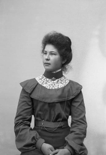 Bildtext: skolkort, elever vid Holmens skola, sjunde klassen. Fr.v. övre rad Göta Sjödin Finnicka, Maj Brolin Rössånger, Gun Östlund Finnicka, Berit Johansson Långvind, Ulla Brolin Fläcka, lärarinnan Rut Ekbrink Holmen, Bernt Strömgren Myra, Lennart Settlin Vedmora
