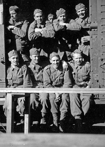 Nio militärer (troligen repgubbar - eller beredskapsgubbar)som poserar från järnvägsvagn