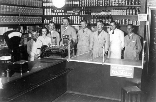 Bildtext: Interiör från Konsumbutiken i centrala Enånger. Från vänster: okänd, Märta Ståby, Sigge Molin, Sven Sundin, okänd, Olle Hedlund, okänd, Knut Lindblom. Text på skylten vid disken: Våra varor kylas medelst Frigidaire
