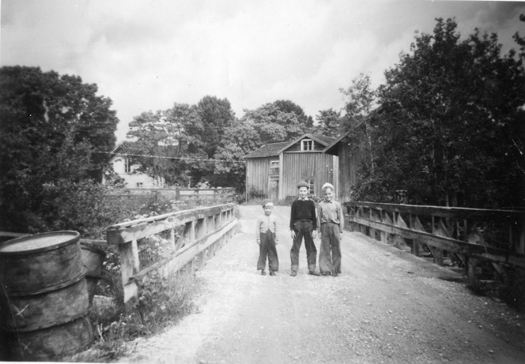 Bildtext: Bengt Söderholm, Nisse Bodin, Åke Heineman. Plats är den gamla landsvägsbron mot Finnika, numera stängd för trafik. Byggnaden bakom bron är riven sen länge.Den hette Månstorp. Lär ha bebotts av en kvinna vid namn Ester Westling, sömmerska. (notering år 1913)